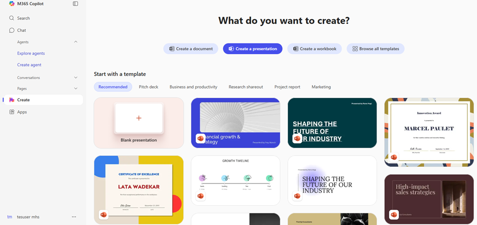 - Untuk membuat presentasi klik Create > Create a presentation.