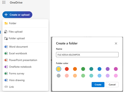 - Anda dapat membuat folder sendiri untuk menyimpan file akan di simpan. Cretae or Upload > Folder > Create a folder.