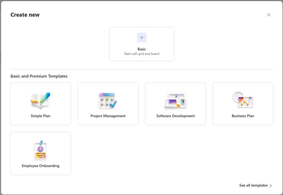 - Tampilan awal terdapat menu Basic, Simple Plan, Project Management, Software Development, Business Plan, Employee Onboarding.